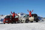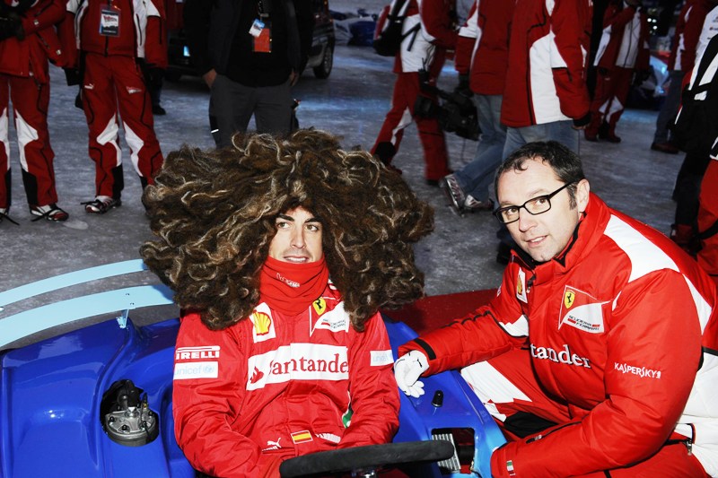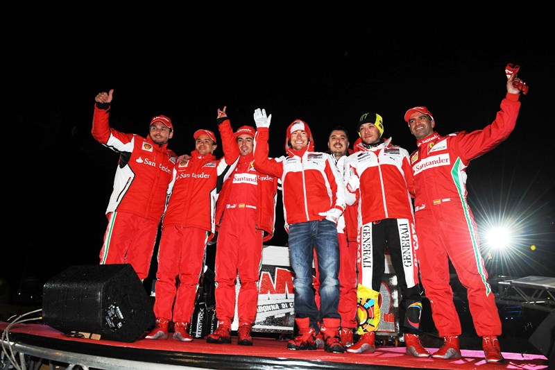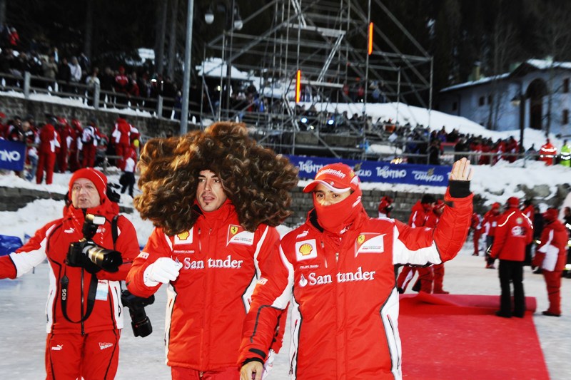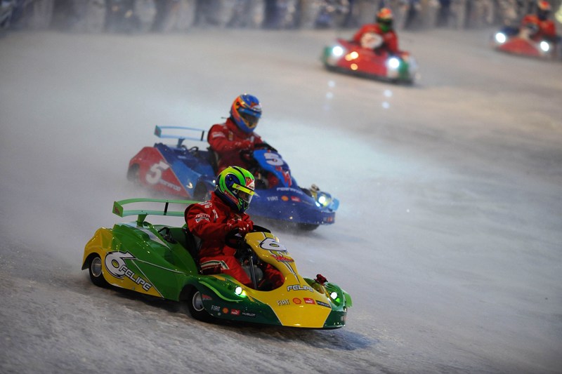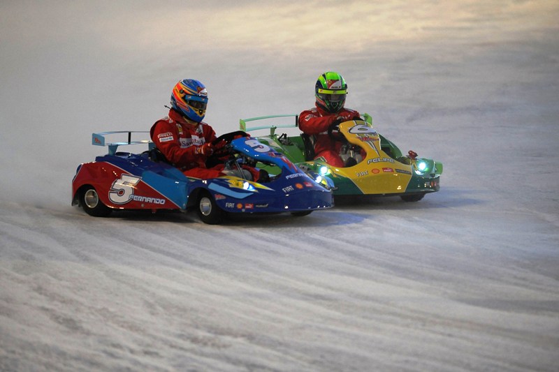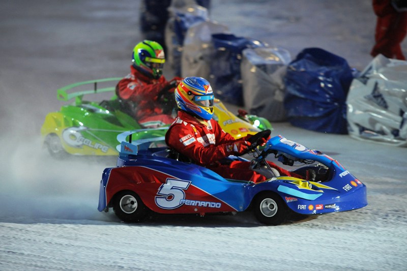 Пилотите първо се качиха в картове, като Фернандо Алонсо най-накрая свали забележителната перука, озовала се на главата му през деня, докато превземаше снежните склонове. Това обаче не помогна - той бе трети и в двете надпревари. При картингите триумфира живата легенда на моторите Валентино Роси, а в надбягването с Фиат 500 пръв стана Фелипе Маса.